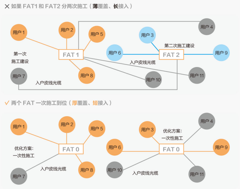 當(dāng)FAT1首先裝滿,沒有空閑端口了,在FAT1周邊的新用戶(如用戶7)無(wú)奈需要連接到FAT2。同樣,入戶安裝距離太長(zhǎng),大大增加了入戶裝機(jī)成本。